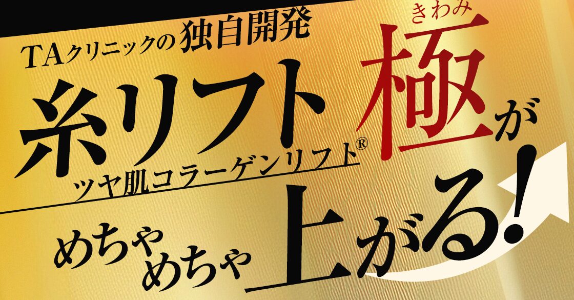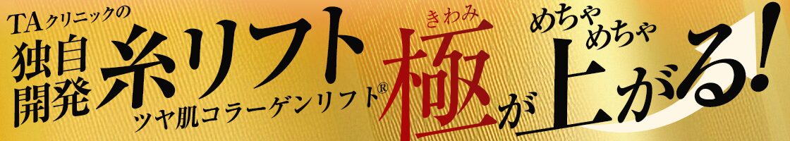 | 施術の説明 | SNSで話題の「TAC式ツヤ肌コラーゲンリフト®」は特殊加工された繊細な極細糸により、頬・額・首・チークラインなどの気になるフェイスラインのたるみを引き上げる、最先端のテクノロジーを用いた「切らないフェイスリフト」です。 |